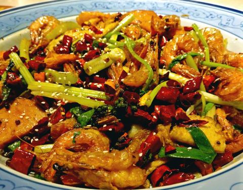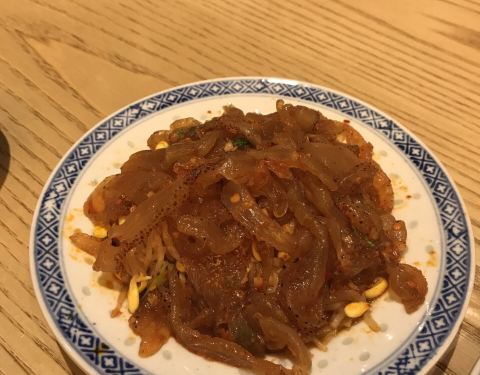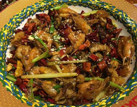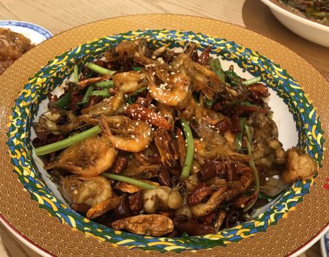 呢间野真系非常之旺,每次行过都基本上有人喺度排队。今次我哋好早就去都要排左一个几钟啊。一路排队一路画幅财神嘅话然之后入去食嘅时候就有两个凉菜餸啦。点了一个香辣虾加上两个凉菜两个饭咁就已经够两个人食啦,香辣虾都几好食呀唔会话太辣。