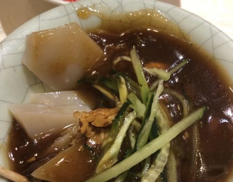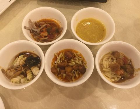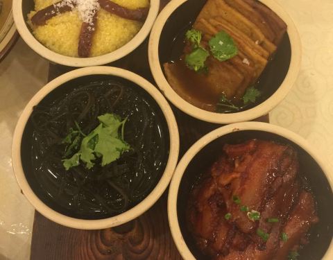 晋菜餐馆,装修很有山西特色,菜品也还不错。第一个上的是素菜丸子,颜值虽然看着没有什么特别的,吃了第一个,大家不由惊叹~太好吃了~虽然是过油炸过,但是一点都不腻,咬起来很酥。素菜的,吃着又健康,特别好。第二个上的是小酥肉,看起来汤汤水水的还有挺有胃口的,吃起来也特别棒。第三道是晋商四小碗,味道和颜值都还是蛮好的,就是128的价格感觉高了点呀,其中一碗就是个海带嘛(同事开玩笑说),不过那碗扣肉,豆干,小米糕还是很有当地特色。最后的那个一口一碗的面,对于已经快吃饱的我们刚刚好。