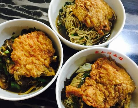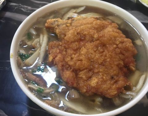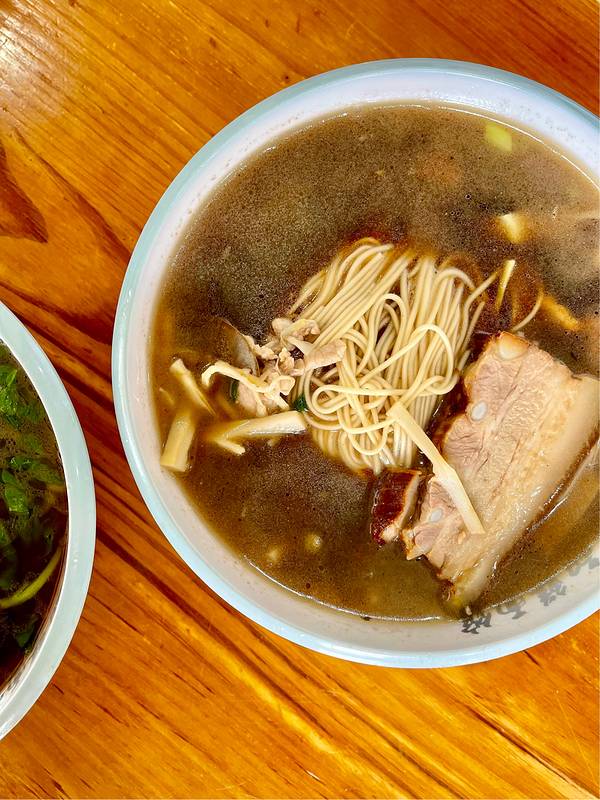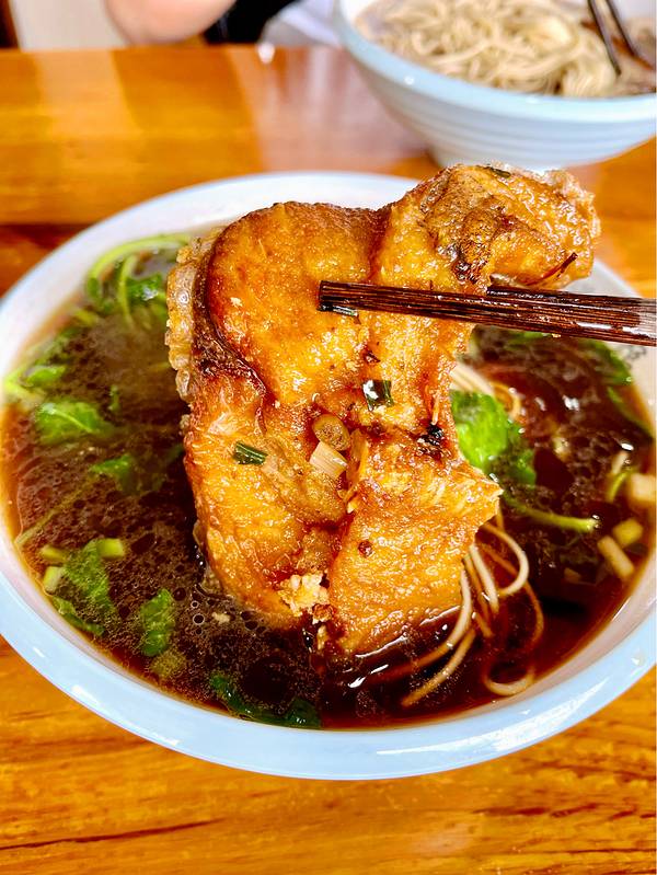 ...看着这里的口味评分还不错,开着导航过来;中午时分食客好多,没有跟风点猪排拌面,点了两碗汤面:爆鱼和焖肉,非常期待苏式面的传统风味。