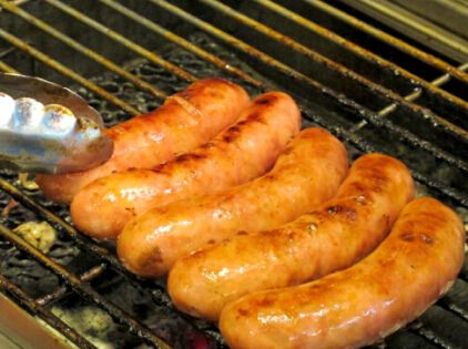 香肠做得很有滋味。用新鲜猪大肠制作,很远就看到摊前长长的排队人潮,串串香肠垂挂在竹竿上,两台巨大的抽油烟机也挡不住烧烤的白烟,烧烤者一个个全副武装,带着斗笠,口罩,袖套,手一刻不停翻烤。