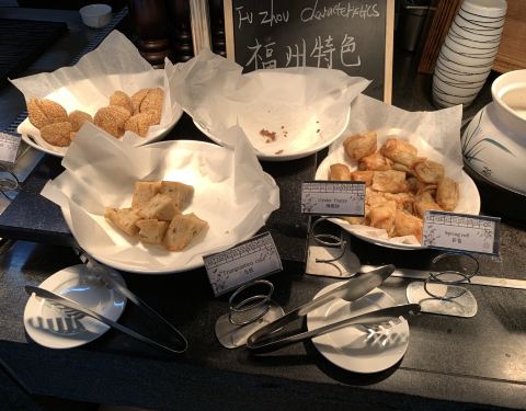 酒店早餐自助位于4楼 取名“绽放” 门口有一排名人墙 即酒店工作人员与住店名人的合照 餐厅宽敞明亮 每块区域分门别类 有鲜榨果汁及福州当地特色小吃 选了靠窗位坐定 餐盘及时回收 微笑服务 西式的羊角很好吃 层层酥皮 配上哈密瓜汁 好甜;再来一碗鱼丸肉燕汤 完美 水果有哈密瓜 西瓜 番石榴 火龙果 很时鲜哦