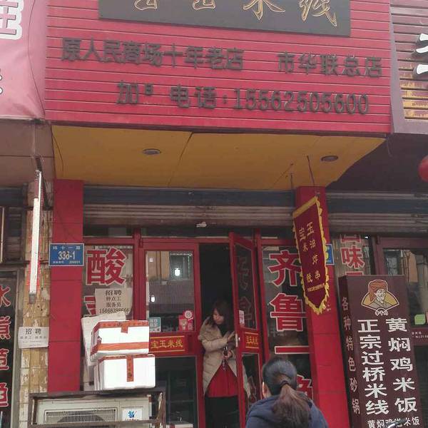 看着挺古典的一个小店,主要是米线,米粉类的食物。还是个连锁经营店呢,在济南还有几个店面。这家在纬十一路内一个胡同内,靠近华联商厦和超市,来往人挺多的。可以团购, 我认为双人团购套餐最划算,两份米线,8个串,2厅饮料,吃的很饱。但串里的广式肠不是很新鲜,其余的还蛮好。 店里环境一般,但人依旧很多。宝玉米线依旧很特别,自制的酱,酱香味很浓郁,泡菜也很特别,额外单点一份泡菜加1块钱。还算一家挺有特色的米线店
