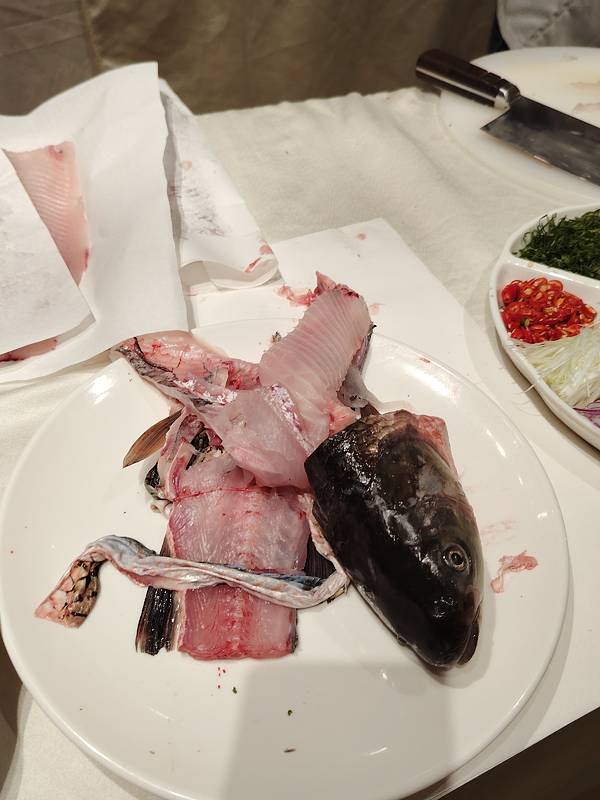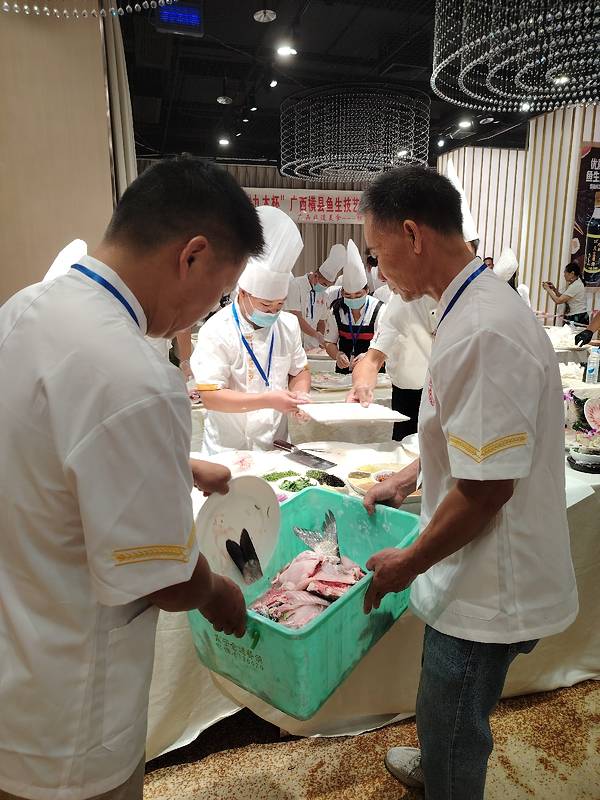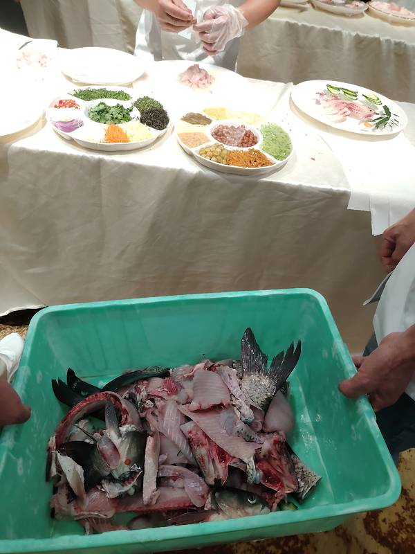 广西横县鱼生技艺争霸赛中的一些画面,横县鱼生只用鱼肉制作,鱼头鱼尾鱼骨都剔除的,于是就看到工作人员收集鱼头鱼尾鱼骨的场面,别以为会丢掉,不会的,拿来做汤或者炸着吃的哦。