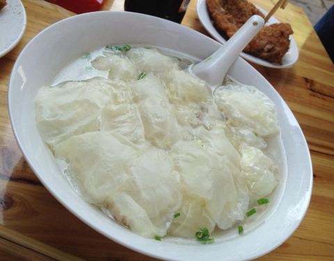 客人还是很多,馄饨不是在于味而是在于型,热水瓶里的味精水,老板油锅里的大排,当地人来吃的人不少,看来还是很接地气的小吃了。
