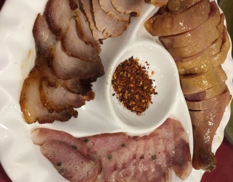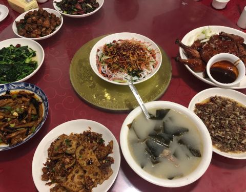 凉米线微甜微辣爽口,烤鸭肉嫩,烧茄子油油的,咸香,水芹菜炒肉末卷饼拌饭一定好吃