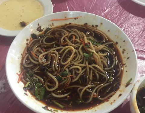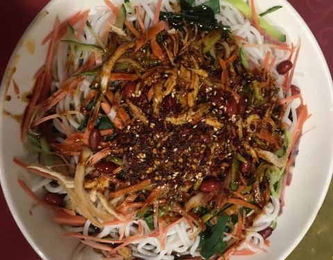 - 凉米线微甜微辣爽口,烤鸭肉嫩,烧茄子油油的,咸香,水芹菜炒肉末卷饼拌饭一定好吃