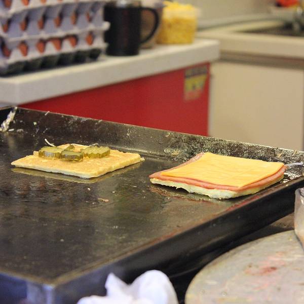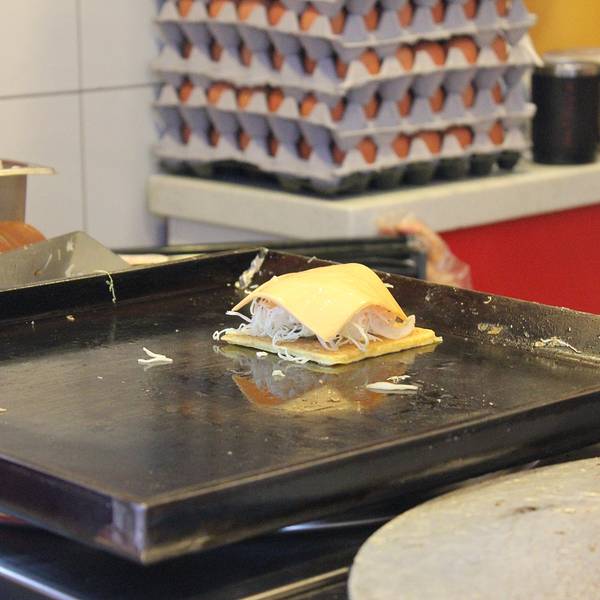 新鲜的切片面包在铁板上加热,烤的脆脆的。周日想早上买一份当作早点,没想到又是休息,遗憾一下下吧