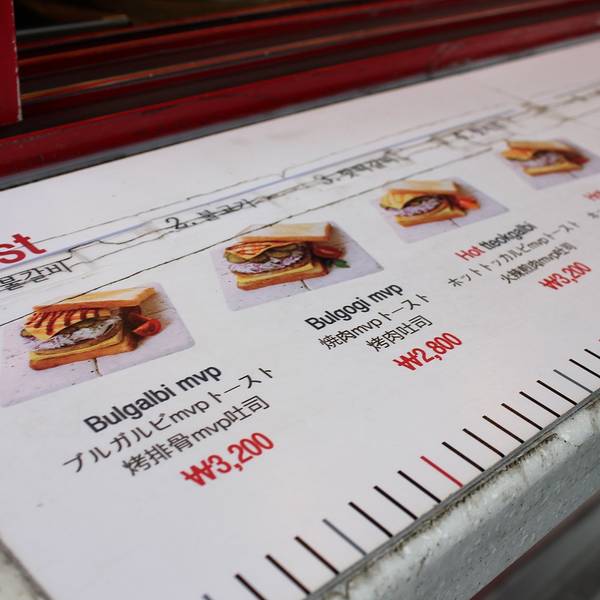 距离新世界百货不远,从明洞地铁站出来步行两三分钟就能看到,旁边是个小超市的网红店一枚,但是确实很好吃。用大块的黄油擦铁板,看着就奢侈。新鲜的切片面包在铁板上加热,烤的脆脆的。我们选择了1号2号套餐各一份,比起麦当当的板烧汉堡还要便宜,肉 蛋 菜更大份,准备回家就按照这个样子也给娃。周日想早上买一份当作早点,没想到又是休息,遗憾一下下吧。