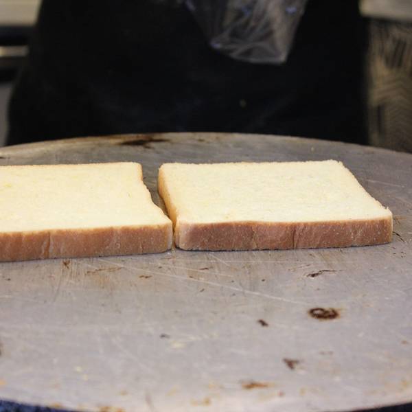 - 新鲜的切片面包在铁板上加热,烤的脆脆的。周日想早上买一份当作早点,没想到又是休息,遗憾一下下吧