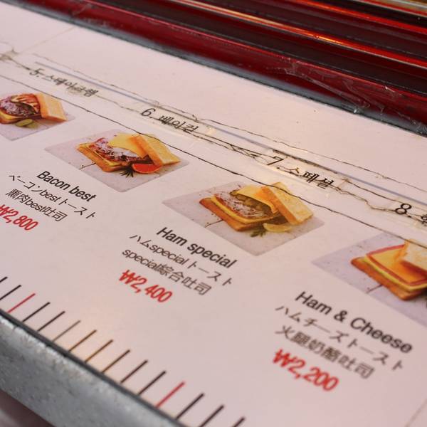 - 吐司7号 这里的吐司1-9号都标好号码啦~我选的这个是7号,依稀记得是猪扒?反正这个很好吃!吐司很松软,中间加了芝士和火腿片还有很多蔬菜,酱料是酸酸甜甜的,肉扒自己带了咸味,总体来说是很多汁很足味的!...- 吐司7号 这里的吐司1-9号都标好号码啦~我选的这个是7号,依稀记得是猪扒?反正这个很好吃!吐司很松软,中间加了芝士和火腿片还有很多蔬菜,酱料是酸酸甜甜的,肉扒自己带了咸味,总体来说是很多汁很足味的!而是完全不会腻的那种!真的会喜欢上。 - 热美式咖啡 韩国人是真的很喜欢喝咖啡啦,一杯咖啡配吐司,冬天真的感觉暖暖的很舒服,不过他家咖啡没有说很特别,我估计是速溶黑咖啡,不是非点不可吖。 反正打下卡是游客必备动作啦,亲测还是很值得试一下的。