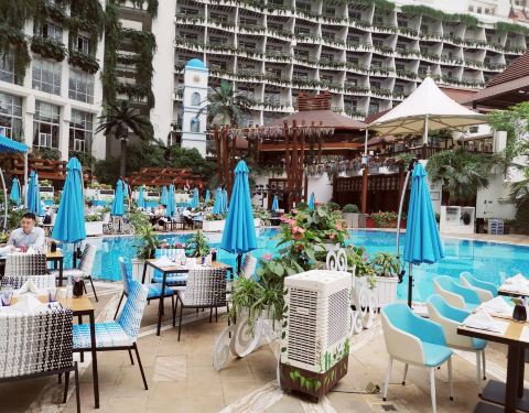 - ...酒店,从大堂到住宿的区域还要坐电瓶摆渡车的酒店还真是少见,自助餐厅就在游泳池边上感觉真是太棒了