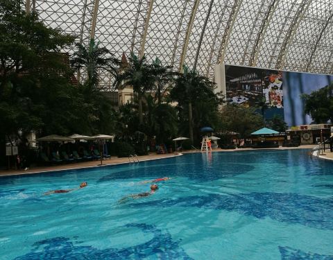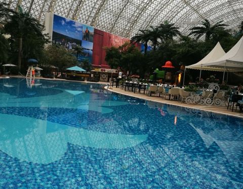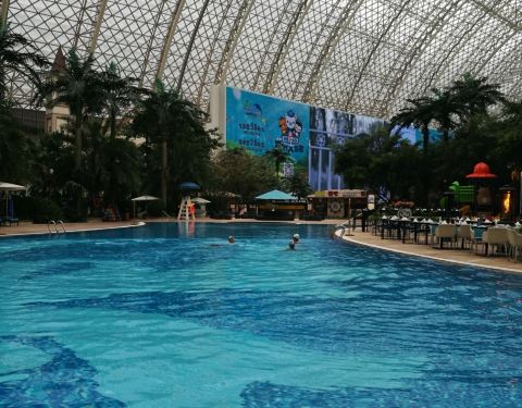 成都高新区的豪华度假酒店,几乎是完全封闭式的度假天堂,很适合亲子游,宛如热带丛林和水上乐园的结合体,地中海的风情建筑很令人放松,住店客人可以享受免费的水上游乐设施,餐食也还不错,就在人工沙滩边上,就是地面有点坑洼,电瓶车太少,走着很麻烦。