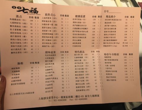 这次的米其林餐厅评选 粤菜馆居多 我大魔都的本帮菜系寥寥无几 吐槽声不断 2016年的生日小特别 选店经过了一番周折 选定家全七福 原因有三 一是讨口彩 二是被评为米其林一星 三是长辈偏爱粤菜&本帮 很顺利的订到了周末的位置(比起其它米星餐厅的预定难问题 这家倒是意外 当天上午还会致电确认是否前往 静安嘉里中心北区二楼 并不是很好找的位置 如同大多粤菜馆的装潢 玄关有屏风 大堂婉约大气 包厢设低消3500起 有安置随身物件的椅子提供 没有评论中菜单价格更改的痕迹(估计已换新 菜品清一色三位数也是意料之中 午市除了菜肴 还有一张点心单 一份在3-4个 可以根据人头算起 茶水选了香片 茶位费26元/人 全单收取10[%]服务费 (漏单 点的菜没一个上 之前也没有核对;斟茶换盘不勤快 完全靠自己;甜品叫起催了又催 最后上来连句抱歉也没有 好意思收服务费? 『有机化皮烧肉』¥130 表层金黄酥脆不腻 肉质紧实带有汁水 一口咬下去满足不已 配的芥末黄酱 有特别加了份白砂糖 根据自己喜好来吧 『脆皮BB鸽』¥90 菜如其名 乳鸽真的脆皮 而且肉质饱含汁水 肉紧吃口不腻 骨头都能嚼碎 有配柠檬汁&海盐粒 个人没派上用场 『菠萝叉烧包』¥42/3件 有着菠萝包蓬松香脆的甜外皮 咸鲜叉烧的内馅儿 勾芡厉害 两者结合的口味并不差 挺喜欢的 『水晶鲜虾饺』¥52/4粒 个头大呢 晶莹剔透的外皮 内附不止一颗的鲜虾肉 吃口饱满富有弹性 『蟹肉韭菜饺』¥39/3件 个头不小 馅儿饱满 皮子薄而透 不粘连 看得见的蟹肉&韭菜肉馅 吃口鲜香 略有小汁水 『浦鱼干烧伊面』¥100 生日要吃面 选了它 伊面的口感一直很喜欢 软绵绵的 又吸收了浦鱼&菌菇的汁水 韭黄为辅一起烧制 优选较心仪的点心菜肴进行评价 其它懒得说~ 对于人均不低 服务平庸的米一星餐厅 未来的路太长(澳门8餐厅 简直甩开它几条马路