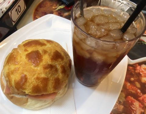 九龙餐室在香港一共有四家分店,分别位于深水埗、荃湾、铜锣湾和北角,而位于深水埗的这一家是其总店。在总店里当然受欢迎的是特色菠萝油,另外还有随时新鲜出炉的蛋挞。这次是选择的不是奶茶,而是冰红茶,菠萝油也没有加常见的黄油,而是加的午餐肉,味道吃起来又与普通的菠萝包别有不同。餐厅里还看到了大明星陈豪来九龙餐室用餐的照片。