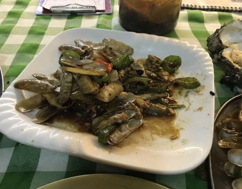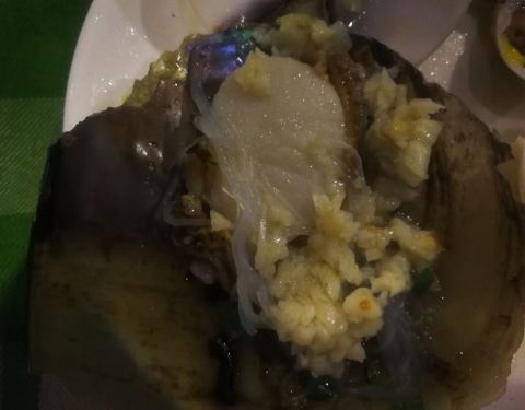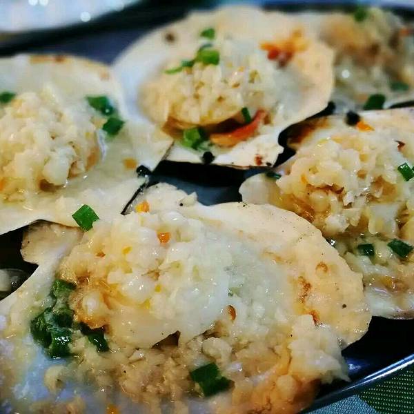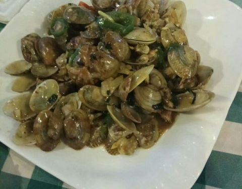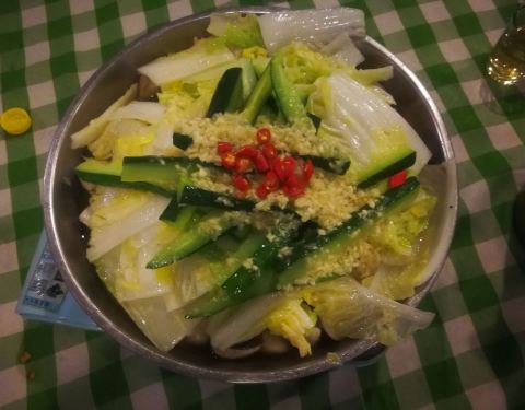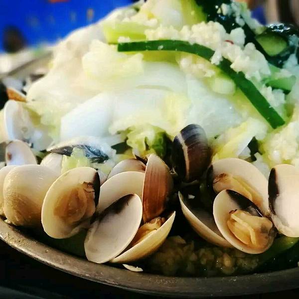 虽然搭在二楼(类似违章建筑)但完全无损其其排档式媚力,看到其高朋满座的情形,便知不佳的环境挡不住慕名而來的海鲜吃货。 啵啵蚌最先上桌,看到每桌都有点此菜,蚌壳被大白菜压底,白菜上边再铺上蒜蓉凉伴青瓜...