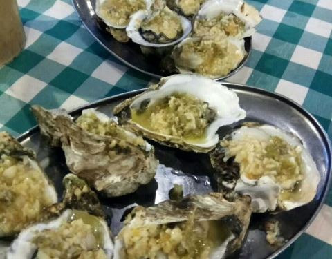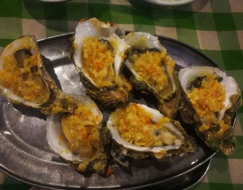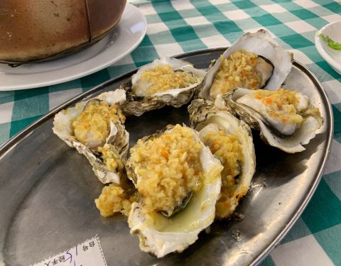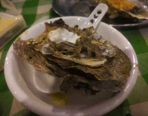 虽然搭在二楼(类似违章建筑)但完全无损其其排档式媚力,看到其高朋满座的情形,便知不佳的环境挡不住慕名而來的海鲜吃货。 啵啵蚌最先上桌,看到每桌都有点此菜,蚌壳被大白菜压底,白菜上边再铺上蒜蓉凉伴青瓜。待深口盘温度升高后,白蚌开始爆开口的声音,突然明白了"啵啵"的意思了。蚌內的含水淌出,加上白菜加热后逼出的水份,形成鲜湯又回煮著白菜及青瓜,一锅微甜清淡的蔬食就此形成。此时将蒜蓉拌入白菜及湯汁中,蒜的呛味又把鲜甜蔬食拉回另一种平衡。这个头菜无论份量,新鲜度及烹煮方式都另人对顺德菜耳目一新。 烧烤生蠔的出品又是惊艳,并非摆盘如何花俏颜值多高,是原味生蠔尚未完全揭壳,表达蠔的新鲜,有别那些換肉不換壳,已去殻不新鲜无良的忽悠货。 烧烤鸡翅风味独特,没有过多的刷上酱料,散发的应是腌过的香味。 可嚼到墨鱼颗粒的烤墨鱼丸与一般以粉为主要材料的丸子,口感有大大的不同。 下次來,要尝尝有手臂长大小的濑尿虾。 不过与其他的排档店一样的缺陷,便是环境的卫生条件恐难与其美味佳餚手艺相提并论。