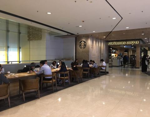IFC蛮大的,逛了好几个小时,该歇歇了,看见星巴克还有空位。这家星巴克还不错,面积挺大的,要舒服的话这里有沙发椅,如果想要干练型办公的话,这里有办公桌和办公椅,我看有好几位都拿着电脑在这里边工作边喝咖...