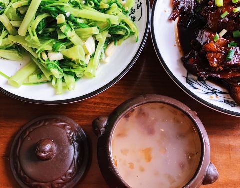预测这两天可能要画风突变,入乡随俗打卡一下当地赫赫有名的金牌商户️于湖光山色中品味农家乐,风和日丽的好天气推荐去二楼露台用餐,一边欣赏湖畔风光一边享用家常菜肴。 太湖一锅鲜是营养丰盛的聚宝盆,汤底很鲜一时忍不住多喝几碗,将黄鱼鲫鱼蛤蜊河蟹一网打尽,最喜欢珠圆玉润鲜嫩Q弹的手打鱼丸。 笋干红烧肉真是甜到忧桑,就连嗜甜如命的小清新都水土不服吃不惯。打破常规尝试一下特色养生炖品鸡头米桃胶,用藕粉勾芡清甜不腻,养颜桃胶鸡头米有点少,每人一盅小心烫口。