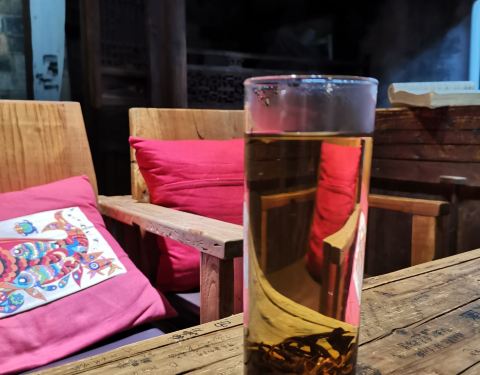 这家地理位置很好,一楼有卖些特色小商品,楼上有二楼和三楼两层,空间算蛮大的,内部是当地老宅子的风格,还是挺有特色的。因为是淡季去的,店里也没什么客人,比较清静,点了两杯饮料喝,口味一般,无功无过,当作歇脚休整一下的地方还是可以的。