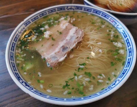 苏州的面最有名了, 这家看点评说不错的, 就在观前街附近,就来尝尝了, 红汤是酱油吗? 里面有一块焖肉和一块像熏鱼一样的东东。 味道还不错,价格小贵。 也是老字号了,话说苏州的老字号面馆真心多啊。