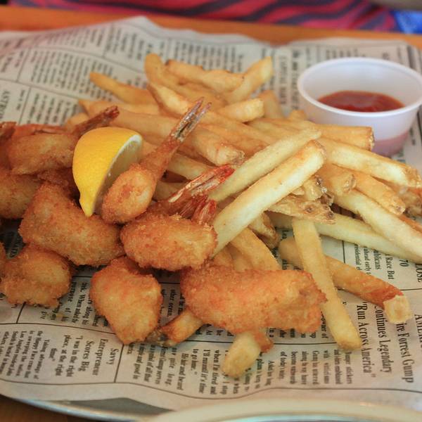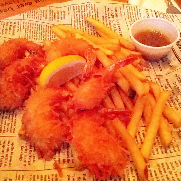 大虾配薯条:下面不是盘子,而是一张很有质感的报纸,估计是吸油,还可以省了洗盘子。虾肉是一整只的,很有弹性而且特别鲜美,不需要放其他的调料也很正的感觉,薯条中规中矩,量很大我都没有吃完。