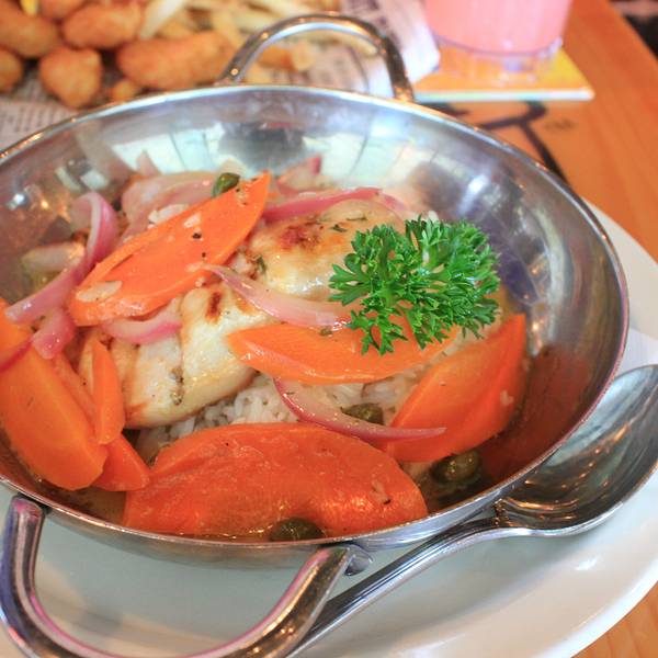 太平山阿甘虾餐厅,这个是在网上买好餐券,A餐85元人民币,店里直接点是238港币。要自己打电话去预约时间,我预约了中午,因为时间早,就可以选择在靠窗的位置,看外面的风景很漂亮,还是不是有上山的火车来开过,店家的菜单很好玩是叫我吃完以后不要忘记运动吗,因为是乒乓球板的造型,特别可爱,这里是点饮料的? 套餐里面有:冰镇饮料、罗宋汤这两个都是一份,还有主食我选择了大虾配薯条和鱼肉芝士番茄饭。这样一餐下来很饱,其实是三选一,但相比其他动辄几百的价格,这样很实惠也很亲民。 阿甘虾主要是以虾为原料,这里不光光是店面布置的造型,门口就有一个很大的卡通人物可以拍照,还没有穿他们特大号的鞋子。搭配里面各式各样的布置,主要以球衣、瓶瓶罐罐、各式各样的贴纸为主,很吸引年轻人的目光,很赞的感觉。 服务员也很热情和客气,都是感觉大学生来这里打工,上菜的速度也很快,而且味道很不错。还会让我们当心菜的热度,因为是刚刚做好上桌的。 大虾配薯条:下面不是盘子,而是一张很有质感的报纸,估计是吸油,还可以省了洗盘子。虾肉是一整只的,很有弹性而且特别鲜美,不需要放其他的调料也很正的感觉,薯条中规中矩,量很大我都没有吃完。 鱼肉芝士番茄饭:锅子看上去很小,但是里面可以放很多的,而且鱼肉很细嫩,味道很符合我的口味,属于很清淡的感觉,配上番茄酸酸的口感,很好下饭。