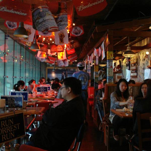 太平山顶上的美式西餐厅,生意很好,靠窗位是最抢手的,能俯瞰到香港美景。阿甘虾餐厅内的设计及摆设以电影...