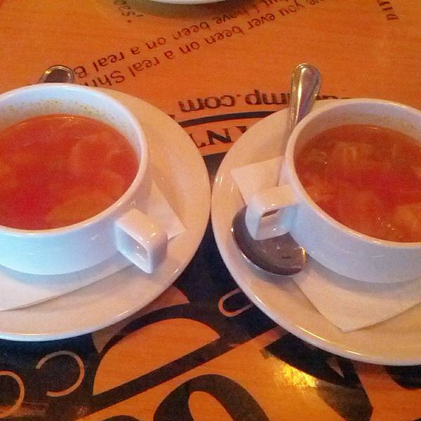 套餐里面有:冰镇饮料、罗宋汤这两个都是一份,还有主食我选择了大虾配薯条和鱼肉芝士番茄饭。这样一餐下来很饱,其实是三选一,但相比其他动辄几百的价格,这样很实惠也很亲民。