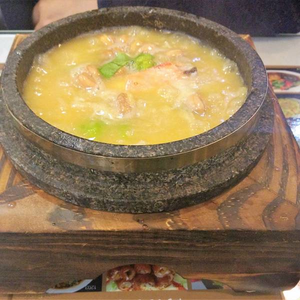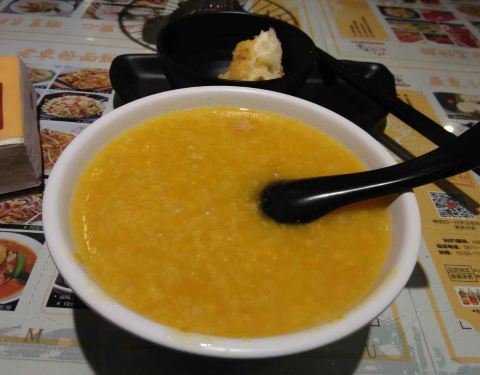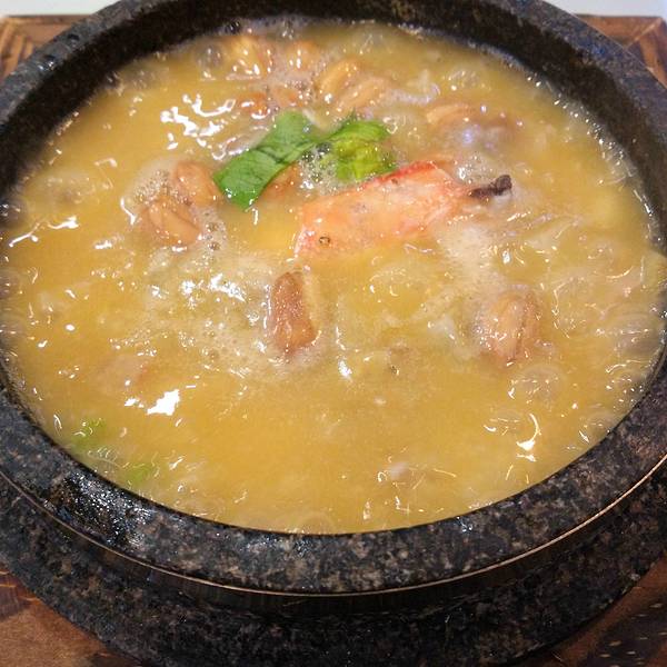 ...很好吃,粥是坐落在木架上端过来的,虾粥的味道也很好喝,果真如服务员所说粥的分量绝对够两个人吃了