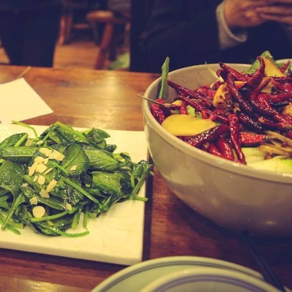 江南驿就在法喜寺对面,由一栋旧式木质二层小楼改造而成,内部也都是木质桌椅,复古又有情调。这里的菜味道出众,口碑也非常好。最受欢迎的是椒麻鸡,滑嫩的鸡肉上放了辣椒葱丝等,非常可口。孜然菠菜、南乳仔排等也很受欢迎。