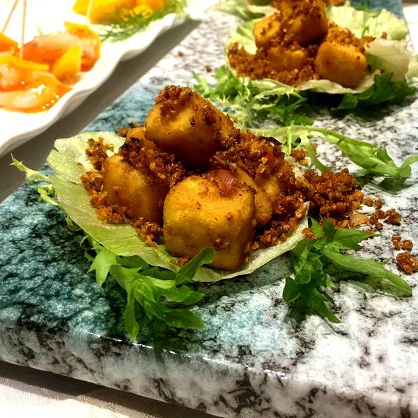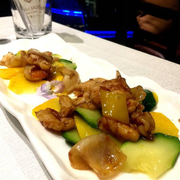 ...颜色很漂亮 用芒果包在虾的外面,有甜辣酱的味道 虾肉非常嫩,口感是滑滑的 很适合夏天吃的一道菜