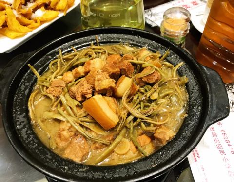 老家地处辽宁河北内蒙三盛交界,饮食上也记兼有一些地方风味,今天这家砂锅店里就吃到了好几道河北小吃: 【咯吒盒】一种绿豆面制成的大小形状类似煎饼的食物,但是厚一些是软嫩的口感,咯吒做法很多种,我打小最喜欢的是咯吒汤,这家是油炸的做法,过油后略膨胀变得酥脆有咬头,撒上白糖就上桌✅ 【煎碗坨】 荞面制成的主食产品,河北小吃,我最喜欢的吃法是凉拌,用小刀划成柳叶状,浇上醋、蒜、芝麻酱拌均即可;这里是切成薄片,沾蛋液两面煎一下,摆盘上桌,再浇蘸汁✅ 【干炸丸子】大小适中,外皮酥脆金黄,里面的肉馅紧实弹牙✅ 【铬豆子】一种玉米面为主的主食,面团在特制模具中按压成细条,煮熟后的格豆子溜滑爽口,夏季吃过水的,冬季吃热汤的,按时令可以配各种卤,今天配的芸豆肉丝卤✅ 店里其他菜品味道也不错,人均消费50元左右就可以了。