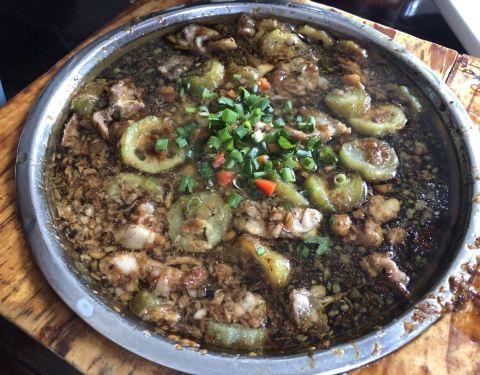家里来了客人,做饭来不及,带他们去离家不远的新方氏餐厅吃饭。三个人六个菜,吃的很落胃。梭子蟹炒年糕,十月份正是吃蟹的好时候,梭子蟹肉多,跟年糕一起炒很好吃。鱼丸炖本鸡,汤比较鲜,锅里除了鱼丸,鸡块,还有香菇,青菜和面条。清远鸡,鸡肉很嫩,配的蘸酱调的味道很好。铜盆牛蛙,点的比较失败。桂花糖藕和红糖发糕还不错。