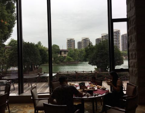 酒店地处常合高速武进高新区出口,自驾比较适合。离大学城以及景点有点距离,周边配套几乎无!所以吃饭只能在酒店内!说说自助早餐吧,就餐人数众多,并没有特别服务的领位员,感觉就是进去随便坐,就会出现拼桌的现象,给人一种侵犯隐私的感觉。这家五星级酒店比较少见的!早餐品种只能算中规中矩,能吃饱,但多样化还有待提高!加州卷不是当场制作的,倒看到厨师从冰箱里拿出来一长条切块。经理有外籍人员,但似乎和外籍住客聊得多。服务人员还有些不熟练,倒咖啡貌似要等些时间!比较喜欢酸奶和咸豆浆自制,落地窗外是人工天鹅湖,很多小动物,小朋友也喜欢,风景还不错!吃好饭,可以去外面散散步。