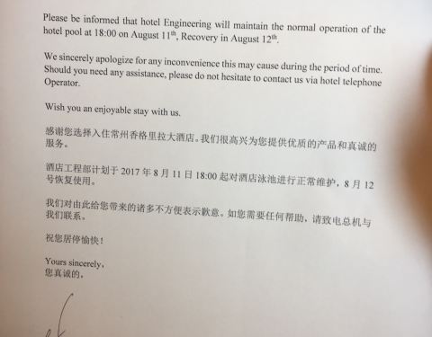 常州香格里拉大酒店位于常州市武进区,从s38常合高速常武路出口下来几百米就到了,这里虽然距离市中心稍远但是到春秋淹城乐园和常州野生动物乐园非常近,所以除了高端商旅住户外也非常适合自驾亲子的游客入住,酒店有亲子乐园和很多小动物很受小朋友欢迎。此次入住我们定的是豪华湖景套房,可以直接享受豪华阁待遇,包括欢迎水果,3人份的免费早餐,全天可免费享用的豪华阁酒水饮料,点心,热食,商务中心等服务。舒适的客房和精致的美食都给我们留下了美好的回忆,当然更值得称道的是酒店工作人员热情和周到的服务,真的让我们全家感受到了宾至如归的享受。比如帮我们办理入住手续的美女经理陪同我们从前台一直送到电梯,另外还有专门的礼宾员帮我们拿着行李并一直送到房间门口,用早餐时工作人员会主动帮我们家的小朋友点单现包小馄饨还送过来,豪华阁的经理和服务人员能在第二次见面时主动叫出我的姓氏来问好。。。恩,如果下次再去常州,我想我还会入住香格里拉。。。