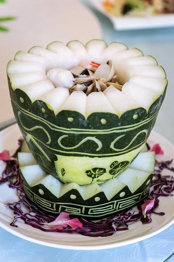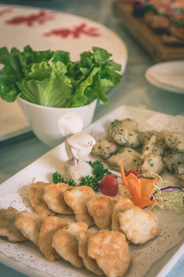 浪漫海岸所在的茂名电白区是个以海产丰富而闻名的地方,都说如果不吃海鲜,就等于没来过电白。所以特地在浪漫海岸海鲜城吃一顿新鲜的海鲜。海鲜城的包房环境不错,一进门先是一个喝茶聊天的茶室,旁边有出菜间、洗手间等。再进去才是一个对着海边的餐厅,餐厅出去还有一个可以看海的大阳台。食不厌精的广东人,从四样不同的蘸碟开始:沙姜豉油、甜辣酱、芥末豉油、酸甜酱。餐前小吃是烤得酥脆的秋葵,蘸上芥末酱油,竟有点吃芥末味薯片的错觉。广东人饭前必先喝汤。在海边最先上的一定是杂鱼汤,又叫鱼仔汤,是粤西一带最简单却也是最鲜美的做法。这些小鱼就是我们早上在海上墟看到的那些,新鲜拖网回来的各种小鱼略煎一下,让表面焦化,然后趁热冲入沸腾的滚水,再放入海盐和葱段,这时一锅白如牛奶的杂鱼汤就煮好了。这是白灼明虾+白灼花螺+原只蒸花蟹的海鲜拼盘,越是新鲜的海鲜,越要用最简单的烹饪方式,保持其本身的鲜美,比较讲究的老饕,会先吃蟹,再吃虾,最后吃花螺。味道由淡与浓,才不至于让舌苔尝不出其中的鲜美。这三种海鲜适合蘸的酱汁也各不相同,蟹肉最鲜甜,可以直接吃或者配一点点醋,而白灼虾适合蘸沙姜豉油,花螺最多人选择芥末豉油或者甜辣酱。香油白切扇鸡是两广地区最有代表性的菜,可以说是无鸡不成宴。首先选鸡就很重要,一定要用足月的走地大剦鸡,不能用饲料鸡。整只用将滚未滚的虾眼水慢火浸熟,然后抹上一层本地香浓的花生油,再斩件上桌。为保证鸡肉不柴,绝不可用猛火。完美的白切鸡是鸡肉刚熟,而鸡骨骨髓略带一点红,这样的鸡肉滑皮爽,入口一阵浓浓的鸡肉香味便会填满口腔。这个沙白螺冬瓜盅简直就是一件精美的艺术品,厨师出神入化的刀工可见一斑。冬瓜和沙白螺本是绝配,平时简单的家庭版沙白螺加点冬瓜滚汤,已经鲜得快要掉眉毛。这个冬瓜盅还加入了鱼丸蟹柳等,味道就更加好了。清蒸石斑鱼,粤菜海鲜的代表,同样的简单的做法,却很讲究火候。鱼肉刚熟透,而鱼骨中心一点红。是为蒸鱼最高境界。石班鱼皮的胶原蛋白丰富,入口弹牙,鱼肉爽滑却又不削,这也是我最喜欢的鱼。鲍汁金瓜野生菌,新鲜的各种菌类放在南瓜里一起蒸熟,淋上同样鲜美的鲍汁,加上精致的摆盘。同样是色香味俱全的一道菜.墨鱼饼拼电城蚝炸,这两样都是电白本地有名的小吃,墨鱼饼剪得表面香喷喷,肉饼却非常弹牙。而蚝炸更是把外酥里嫩演绎到完美之境,外面那层薄薄的粘米粉加蛋浆炸得酥脆,而里头的蚝仔却依旧嫩滑带汁。虽然这是普通的街头小吃,但并不是每一个厨师都做得好,要么是蚝仔不新鲜,要么是炸得过火,蚝仔都变得干硬,要么油温不够导致表皮吸油过多。把街头小吃做得完美极致却也是非常不简单的事。白灼水东芥,水东鸡心芥是来这里一定不能错过的一味青菜,水东的鸡心芥是非常神奇的蔬菜,只有在本土种植才能保持清甜无渣,一到了外地,不同的风土就马上变得苦涩。如果说有什么蔬菜是最恋家的,那非水东鸡心芥莫属了。连平时不太吃青菜自认是绞肉机的我,都抢着把这碟水东芥一扫而空。