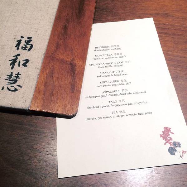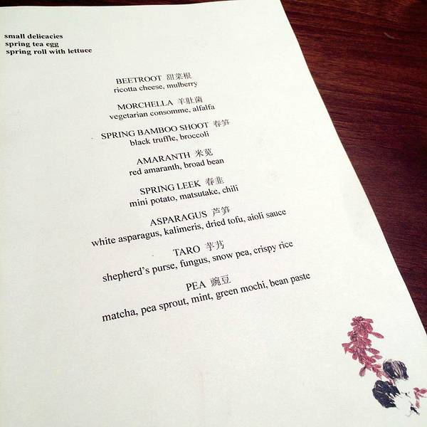 餐厅不提供单点菜单,三种价位的set menu,都是8道菜的分餐制。菜的名字也相当朴实,基本上是直接以主要食材命名,完全不是斋菜的那种让人云里雾里的风雅词汇,也不是用浓烈荤菜来命名素菜的寻常素菜馆那种怪异笔法。