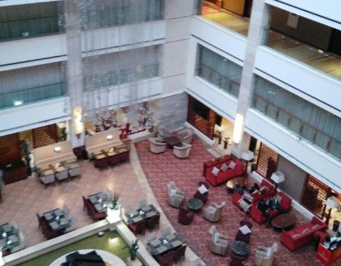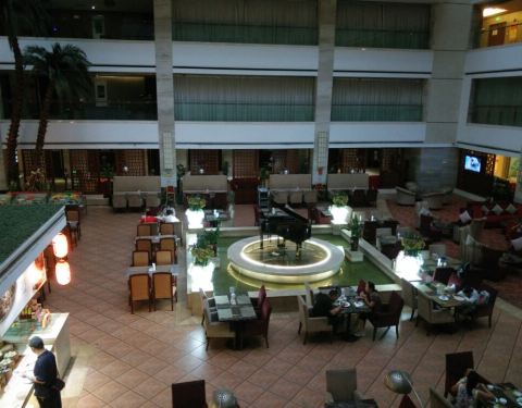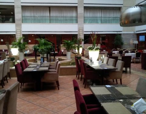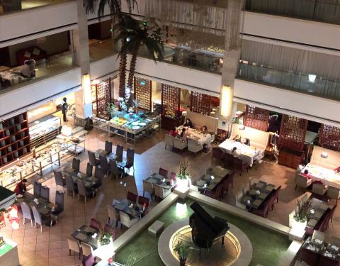 自助餐厅环境真不错,大厅中间是水池里面还有一架钢琴,座椅挺舒服,早晨餐品种还是很多的,就是炒菜...