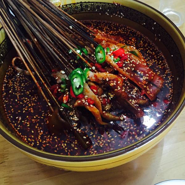乘公交车回酒店遭遇下班晚高峰,根本挤不上。距离酒店1.5公里,果断徒步回去。碰巧路过张公桥美食街,最新版LP《四川和重庆》上推荐的乐山特色美食中,这家店适合一个人吃。于是乎体验了川菜上河帮乐山的牛肉豆腐脑、肥肠夹饼、钵钵鸡,我只想说,非常好吃!