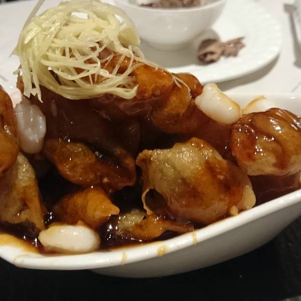 餐厅里面的设计我却很喜欢,虽然显得很拥挤,桌子基本摆的很近,但是感觉很复古很典雅,就像再上海滩拍的老电影一样。整体装修也是复古的。菜价略贵,这样的地段你懂的。人均160左右。当时点了一个冷盘是蜜汁藕,他竟然是草莓汁加藕,这样的水果和蔬菜搭配很新颖,其实蜜汁藕就是江浙一道老底子的菜,这样的改良给人眼前一亮。推荐大家可以尝试一下。另外一个创新菜就是杭帮菜里的炸响铃,在里面裹了提前去刺的鱼肉,因为炸响铃吃多了本身就会给人比较油腻的感觉,里面裹了鱼肉刚好可以综合掉这样的油腻。加上配上的酸辣酱和番茄酱更加有点小清新。因为带着宝宝吃饭,特意还点了一个桂鱼汤,里面辅料很多,有鱼圆还有一只湖蟹。整个汤头非常浓。