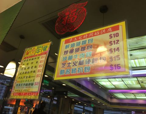 住在上环的宜必思,酒店的斜对面就是新五龙粥面茶餐厅。菜单倒是挺丰富的,有炒牛河、公仔面、乌冬、米线,还有各种的炒菜。乍一看各样炒菜的价格都是60块,像鱼香茄子、椒盐猪扒、黑椒牛柳,通通都是60块,当时觉得贵,后来在香港呆的时间久一点,就觉得这个价格简直很亲民了。住在宜必思并没有提供早餐,所以常常都是在这家新五龙餐厅吃上一个菠萝油,再配上一杯红茶,这是最典型的香港早餐。