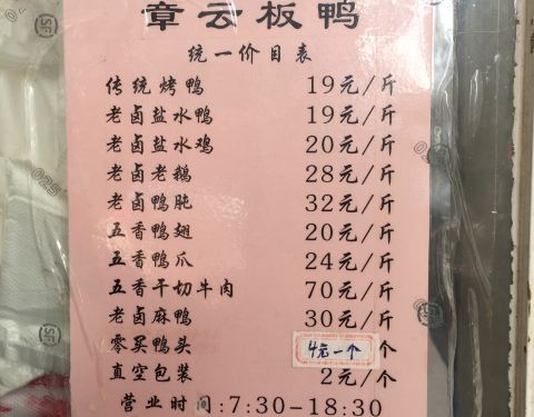 时隔5年再游南京 搜罗当地美食美景 章云板鸭 升州路上的百年老店 周末中午过去 就看到长长的队伍 只有一间房 一个小窗口 卖熟食的地儿 没有堂吃 贴了一张价目表 不切的可以免排队 真空包装2元一个 该店没有在网上销售或团购 谨防假冒受骗 老卤盐水鸭 19元/斤 买了一只论斤称 外加包装 一共59元 这是外带的 现场要了份传统烤鸭(鸭前脯)13元 送了老卤 看上去肉质鲜嫩 可惜皮厚且肥 所以称不上好吃 营业时间 上午7:30到晚上18:30