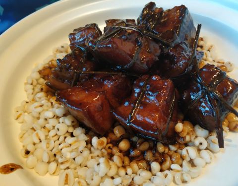 - 新菜里,酒香东坡黑猪肉挺好吃的,做得很讲究,五花肉用草扎上,底下垫着薏米。福朋酒店的中餐厅,小贵