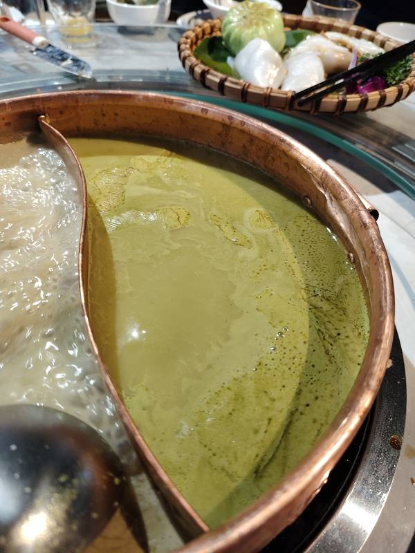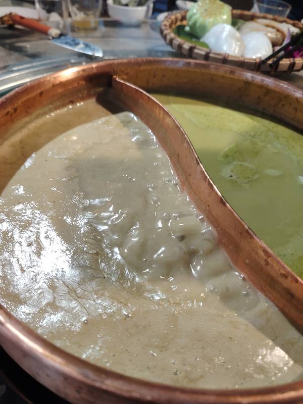 实况拍摄:翻滚着的双色油茶。 这是瑶乡火麻鸳鸯油茶,由南宁亭洪路的唐大厨都安黑山羊大吃府首创,左边的是火麻油茶,右边的是恭城油茶,这鸳鸯油茶营养丰富,浓郁醇香,已经成为广西人自己的早茶中的招牌。