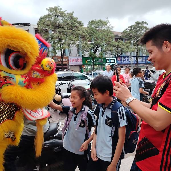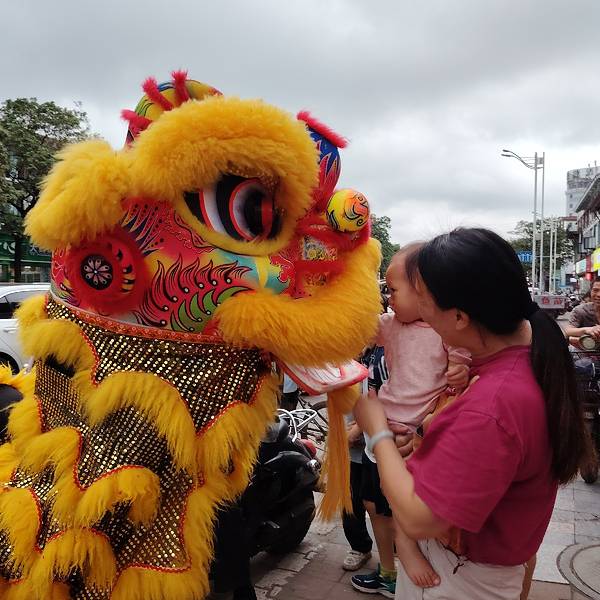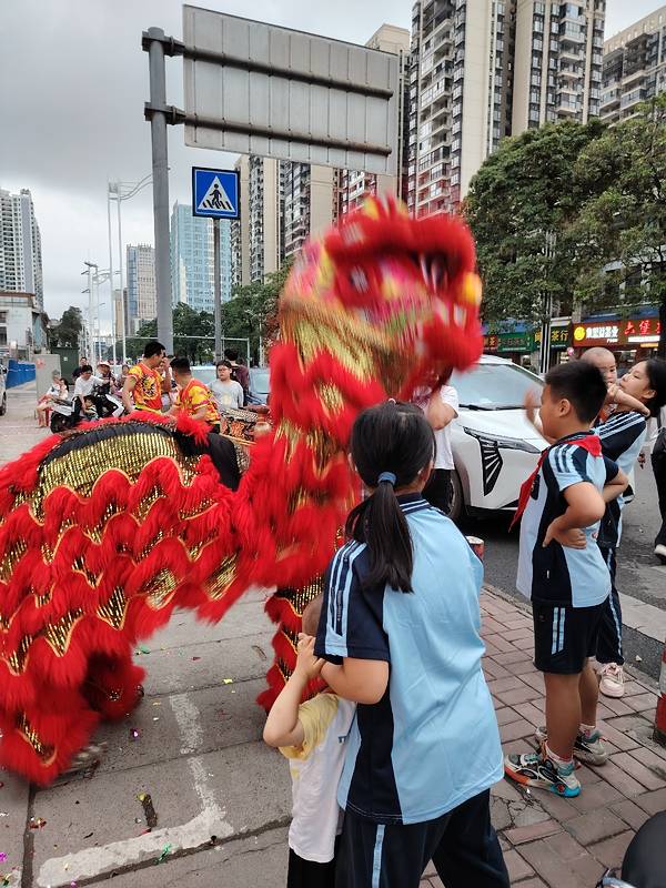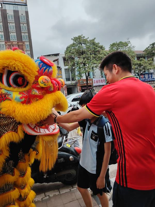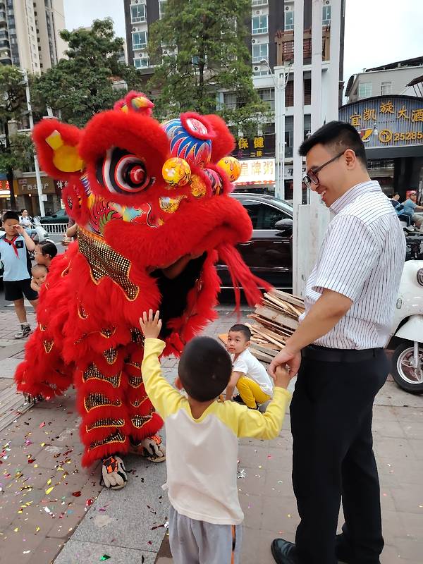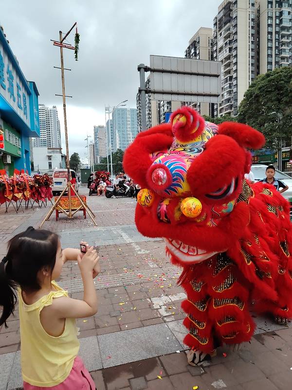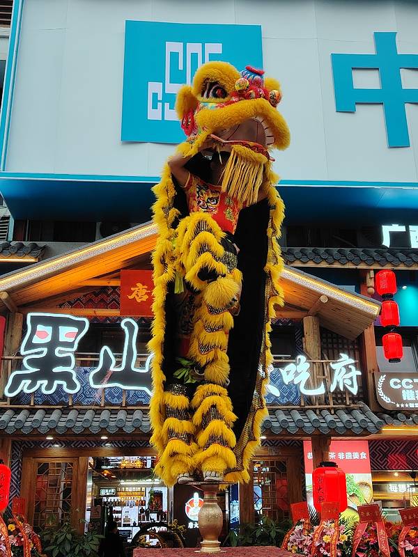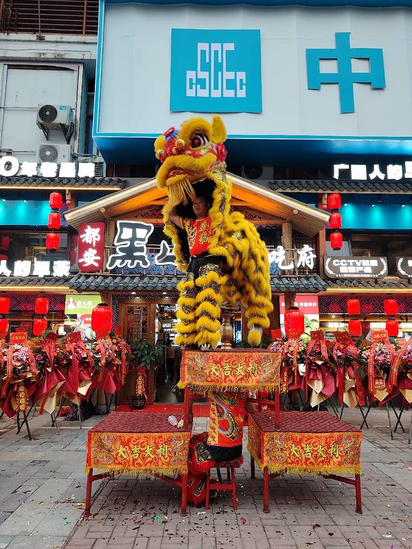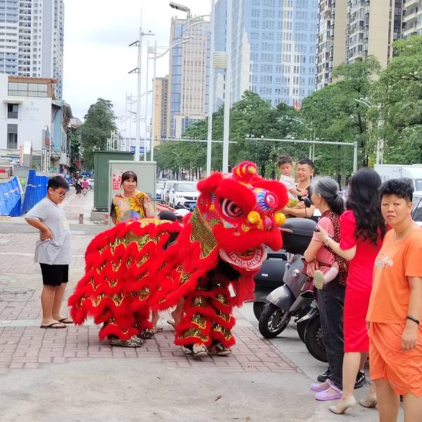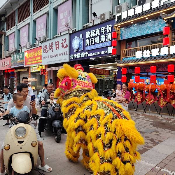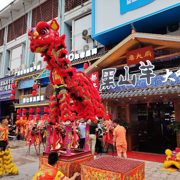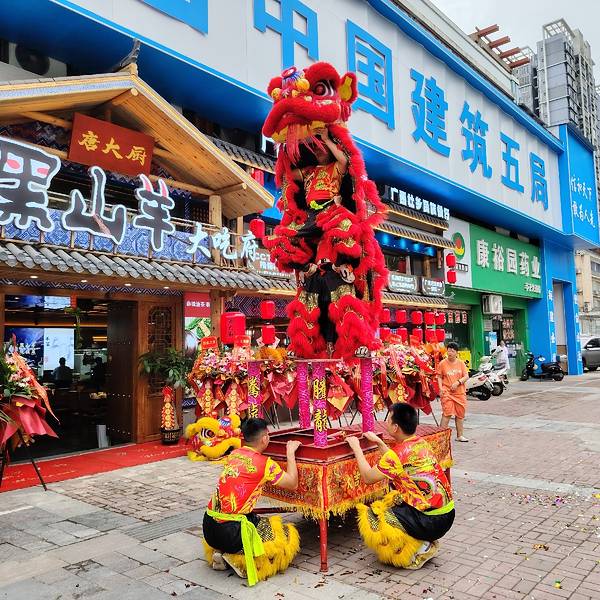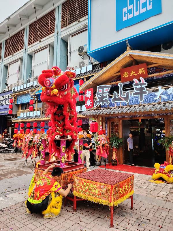 在南宁亭洪路,好多人在看醒狮表演,原来是唐大厨都安黑山羊大吃府开业请来的醒狮队,这狮子的飞跃腾挪都很厉害的。