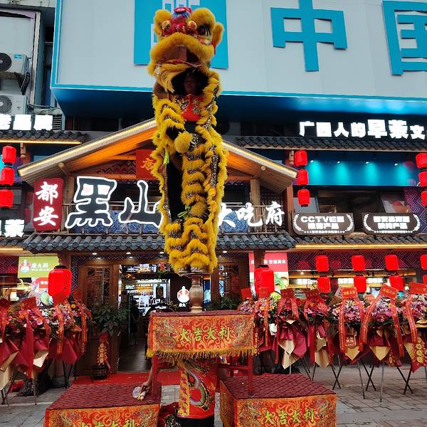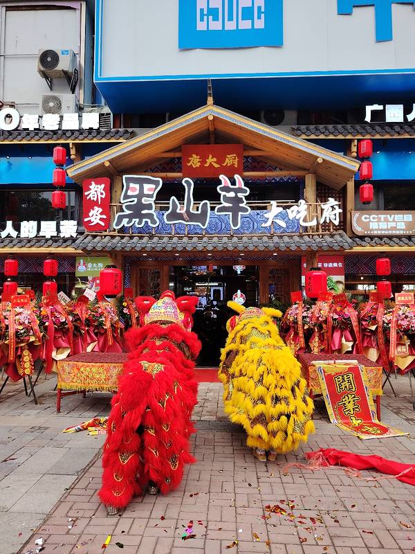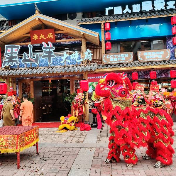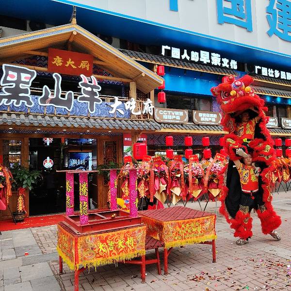 广西壮乡风味,传承早茶文化。 唐大厨都安黑山羊大吃府4月30日重装开业,请来醒狮队表演,狮子跟现场市民有很多互动,小朋友们都好喜欢。有个小女孩还用手表一直拍呢。