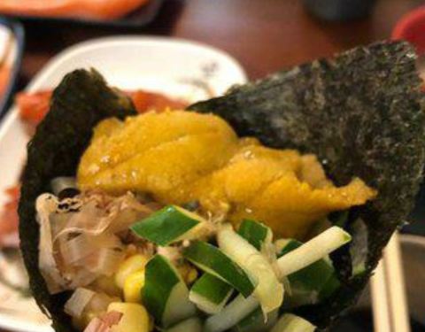 今天去吃、真的很一般、生鱼片真的好厚、没什么刀功、没什么鱼的部位区分、就是块大、肉厚、味道一般、真还不如在捷运里面的日快餐好吃、海胆一份五块、很多、很大。。