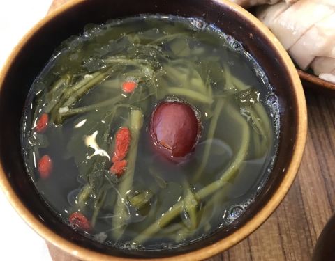 有位上海朋友来新加坡旅游,中午带她来吃海南鸡饭。星期天中午,餐馆坐满了人,还好我们两人可以与其他顾客搭台。 点了两份黎记海南鸡饭套餐,一份是白斩鸡,另一份是烧鸡,还点了两杯海南茶C。 朋友说鸡饭很香很美味,她可以只吃鸡饭,无需配菜。 西洋菜汤清甜,烧鸡皮脆肉嫩,朋友比较喜欢吃烧鸡。我们两个女生觉得他的一人份的套餐真是太多了,吃得好饱,“害”我们吃不下甜品
