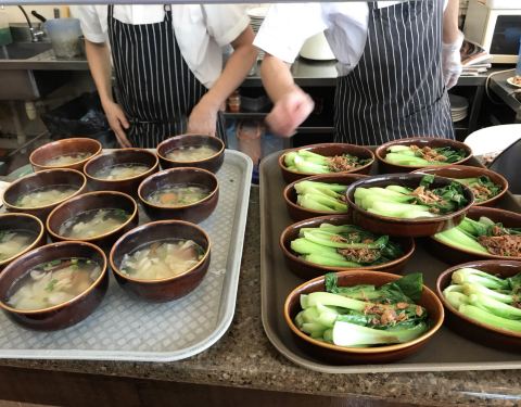 - 星期天中午,餐馆坐满了人,还好我们两人可以与其他顾客搭台