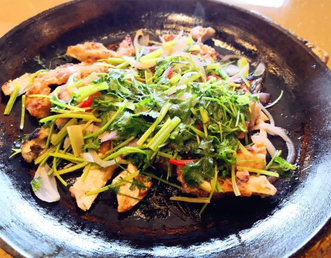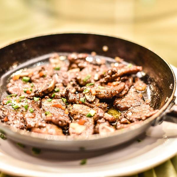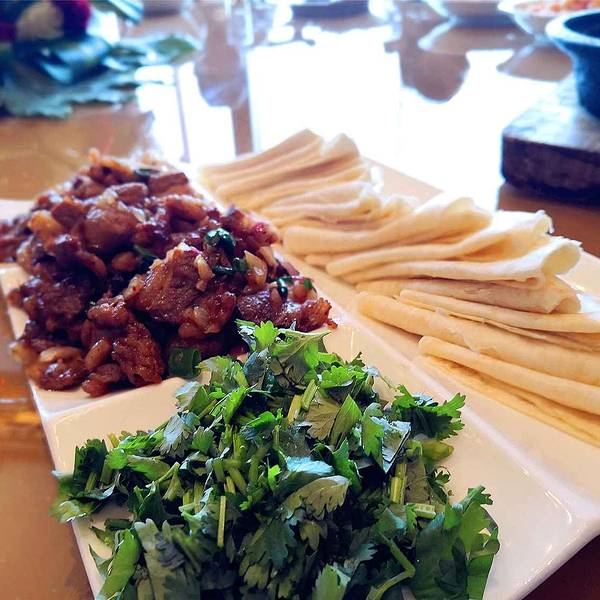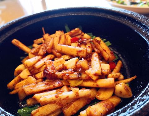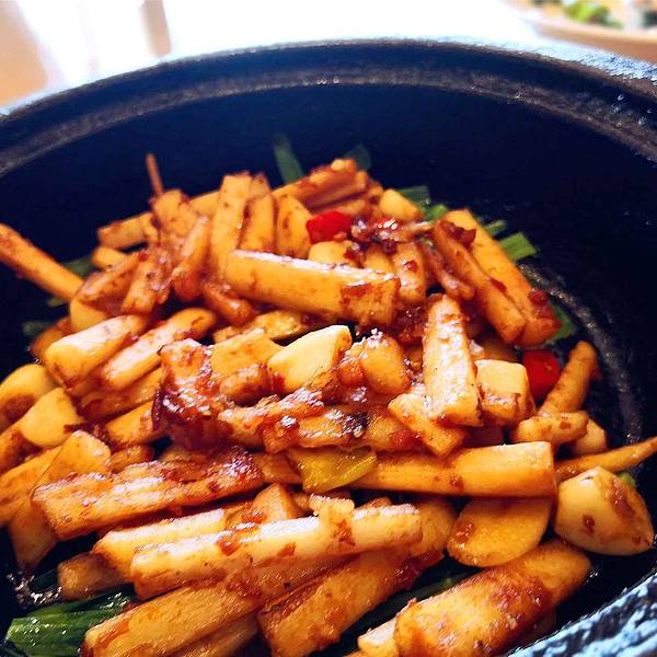 这次点的菜比较多,味道总体来说都还不错。印象比较深刻的是一个可能叫做石锅煎鱼的菜,用很大的平底石锅装着大块的鱼,鱼肉很嫩也很香。另外酸酸甜甜的土豆球味道也挺好,平时家里不是这种烧法,感觉这种吃法挺有新鲜感的。木耳山药这种搭配也比较新鲜,一般山药都是用来煮汤或者清炒的,像这样红烧的做法我还是第一次见。还有一道面饼夹肥牛和香菜的菜,也让人印象深刻。